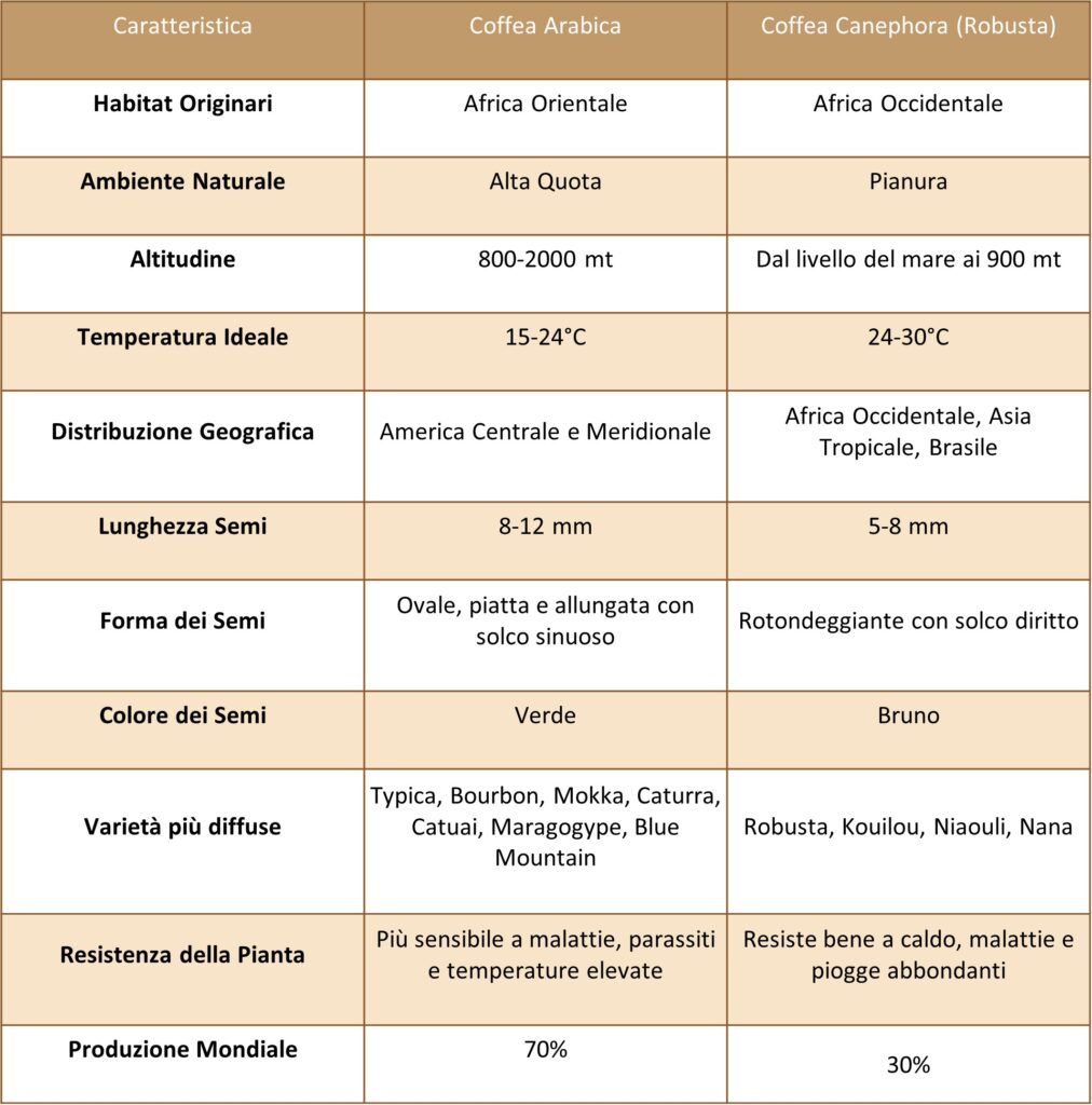 Coffea Robusta: o Canephora, trae le sue origine dall’Africa tropicale. Questi chicchi permettono di produrre una bevanda dal sapore più delicato rispetto al Coffea Arabica.