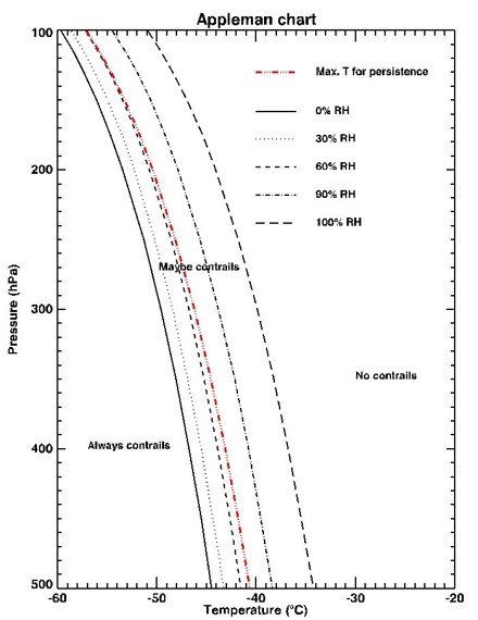 Nel grafico di H. Appleman notiamo che le due linee più importanti sul grafico sono la linea dello 0% e quella del 100 % (umidità relativa). Se l’atmosfera è più fredda rispetto alla temperatura indicata dalla linea del 0%, la “scia di condensazione” si forma anche se l’umidità relativa dell’atmosfera è pari a zero. Questo perché l’aereo fornirà abbastanza umidità per produrre la “scia di condensazione”, e non è necessaria umidità dall’atmosfera per formare la nube. Secondo il grafico, le “scie di condensazione” si formano sempre quando il valore della temperatura è a sinistra della linea dello 0%. Se l’atmosfera è più calda della temperatura indicata dalla linea del 100%, la “scia di condensazione” non può formarsi anche se l’umidità relativa dell’atmosfera è del 100%. In tale campo l’umidità combinata del gas di scarico dell’aereo e quella dell’atmosfera non sarà mai abbastanza per generare una nuvola. Quindi i profili di temperatura a destra della linea del 100% non daranno mai luogo ad una “scia di condensazione”. Per le temperature comprese tra le linee dello 0% e del 100%, la possibilità che si formi una “scia di condensazione” dipenderà dall’umidità atmosferica, che nel grafico viene rappresentata come umidità relativa. Quando la temperatura è compresa tra le linee dello 0% e del 100% la “scia di condensazione” può anche formarsi, ma non sarà persistente.