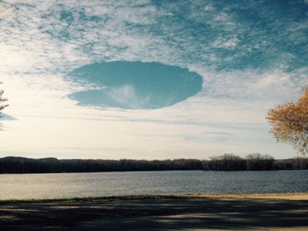 Abbiamo poi i Fallstreak Holes e le Dissipation Trails. I Fallstreak Holes, noti anche come “Hole – Punch Clouds”, sono ampie aperture circolari che si formano all’interno di banchi di nubi di tipo altostrato o cirrostrato. Questi buchi nella copertura nuvolosa sono generati dal passaggio di un aeromobile, che provoca la formazione improvvisa di cristalli di ghiaccio. Il meccanismo di formazione è legato alla presenza di gocce d’acqua sopraffuse, ossia in stato liquido nonostante la temperatura inferiore a 0°C. Quando un aereo attraversa uno strato nuvoloso contenente queste gocce, la turbolenza e la riduzione di pressione innescano un rapido processo di cristallizzazione. I cristalli di ghiaccio risultanti crescono rapidamente a scapito delle gocce d’acqua, che evaporano e lasciano un’area priva di nubi, creando il caratteristico foro. Perché questo processo abbia luogo, sono necessarie però condizioni atmosferiche specifiche, in particolare temperature comprese tra -10°C e -20°C e la presenza di uno strato nuvoloso sottile e sovrassaturo (umidità relativa molto alta).