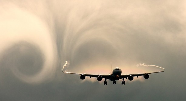 Infine i vortici di estremità alare (Wingtip vortices), sono spesso ritenute un tipo di scia di condensazione, ma sono in realtà prodotte da un processo diverso. In condizioni meteorologiche molto specifiche, si possono vedere delle scie di vapore formarsi nella parte posteriore delle estremità alari degli aerei a reazione durante il decollo o l’atterraggio. Questo fenomeno si verifica a causa di una diminuzione della pressione e della temperatura mentre l’ala genera portanza (lift). Una cosa similare avviene, in determinate condizioni atmosferiche, anche nei GP di F1.